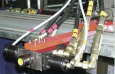 聚氨酯組分原料經過連續高壓發泡機的計量泵精密計量后,按照一定配比,被送入混合頭均勻地布料在復合板的底層面材上,并和上層面材同時被送入雙履帶層壓輸送機,聚氨酯泡沫在雙履帶層壓輸送機的上下輸送鏈板間發泡,并固定成型。待固定成型后,復合板在生產線上被自動跟蹤,切斷機按需切成一定長度的成品。